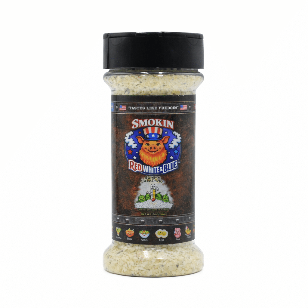 Smokin Red, White & Blue Jumpin Jalapeño brings together real wood smoke and just the right amount of heat. It starts with kosher salt that’s cold-smoked over hickory, oak, maple, and cherry, then blended with dried jalapeño for a clean, balanced kick.